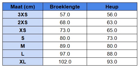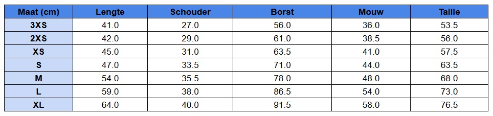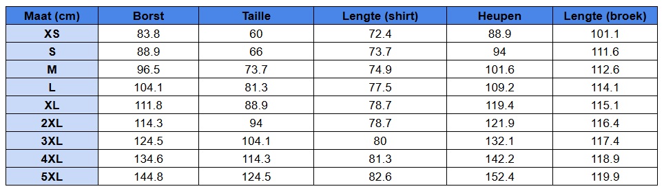 Raadpleeg deze maattabel om de perfecte pasvorm te kiezen.
